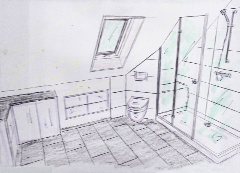 Als die Wohneigentümer an badgestalten herantraten mit dem Wunsch, zu prüfen, welche Möglichkeiten es gibt, ihr kleines Badezimmers unter dem Dach neu zu gestalten, waren sie zunächst sehr skeptisch, ob man auf 6,5 Quadratmetern Grundfläche, noch dazu eingeschränkt durch die Dachschräge, überhaupt ein hochwertiges Genussbad für zwei Personen herstellen kann. Umso überraschter waren die Kunden, als ihnen drei Wochen später Peter Falk die Entwürfe präsentierte. Die Entscheidung fiel schnell und wenig später fing der Umbau an. Zunächst wurde der Raum inklusive Wandschränken und Decke angepasst, dann Fliesen für Fußboden und Wand eingebaut, Malerarbeiten verrichtet und schließlich die Objekte und maßgefertigten Möbel eingebaut sowie die Leuchten angeschlossen.